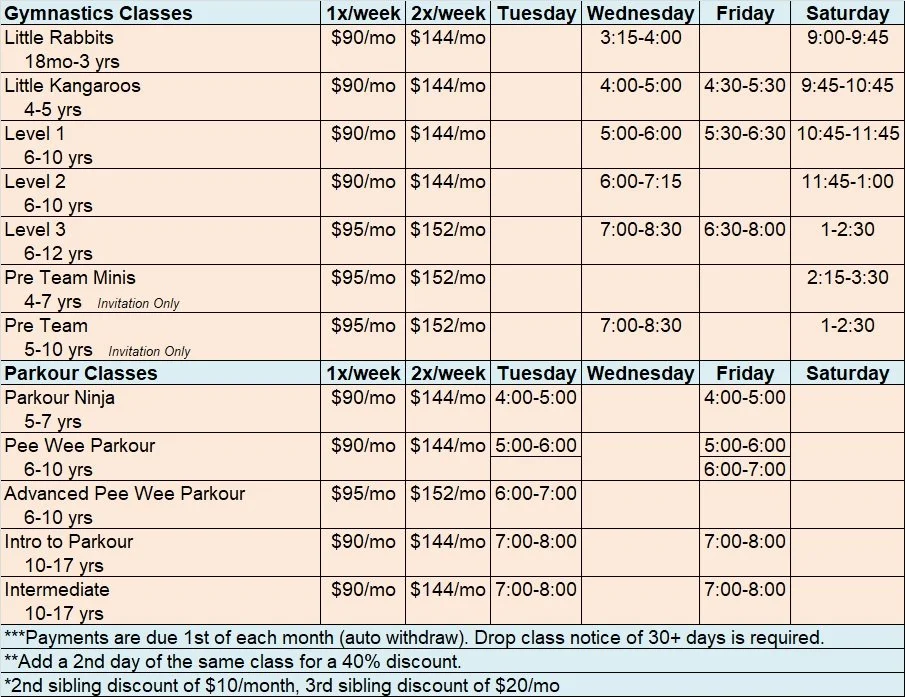 Month to Month Classes (monthly prices listed from 1st to last day of each month)